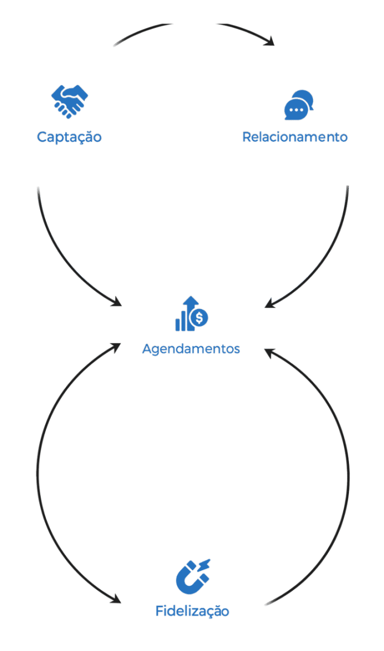 É nossa metodologia exclusiva que substitui o antigo funil de marketing por um ciclo de crescimento contínuo. Esse ciclo une quatro pilares: captação, relacionamento, agendamento e fidelização — tudo integrado em um modelo sustentável e escalável.